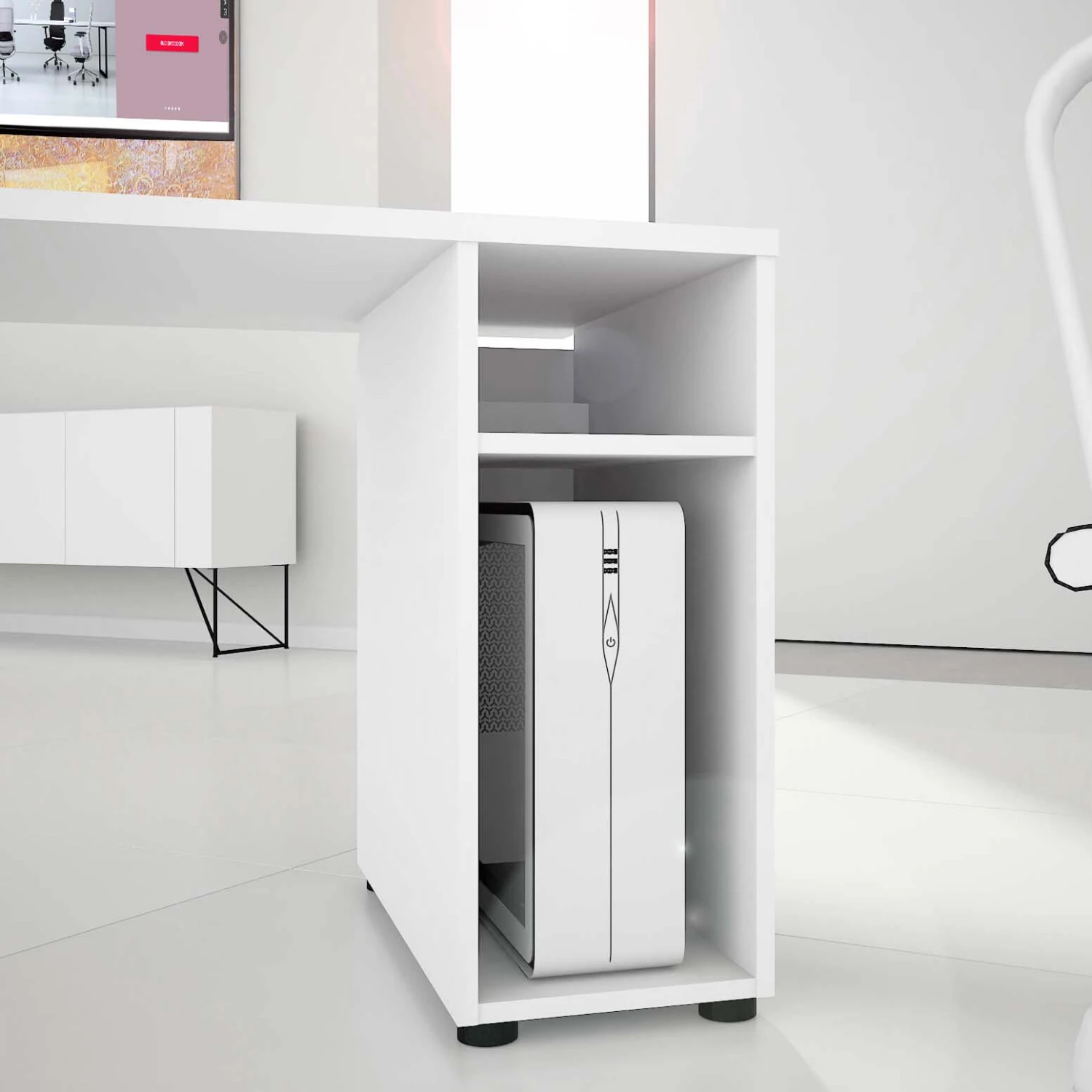 - Mit integriertem Rechnerfach und Kabeldurchlass, sowie einer Kabelauslassdose in der Tischplatte
