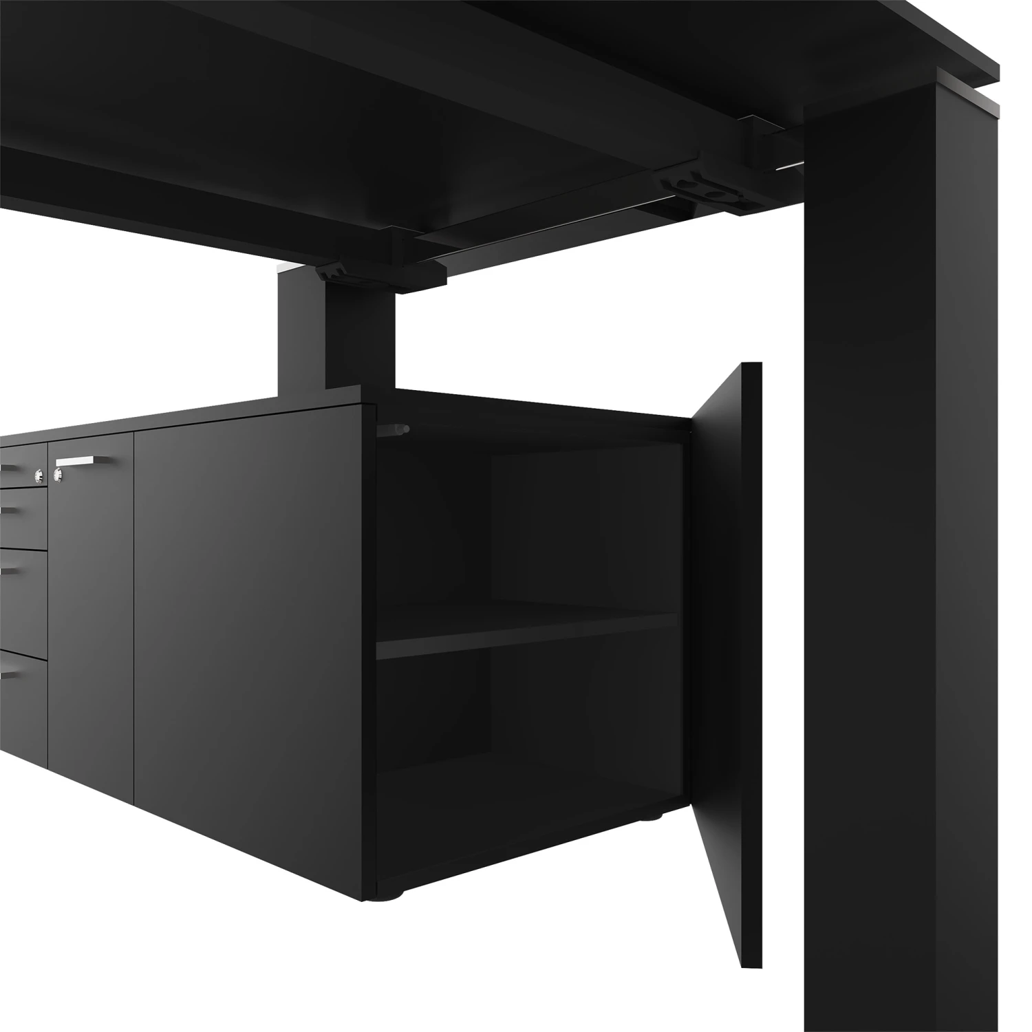 | Maße | Schreibtisch Breiten 1600, 1800, 2000 mm, Tiefen 800, 1000 mm, Höhen 740 mm, Lowboard BxTxH 1690 x 568 x 546 mm |