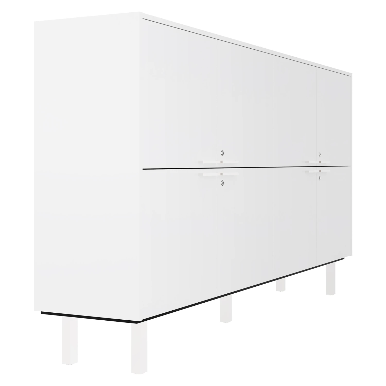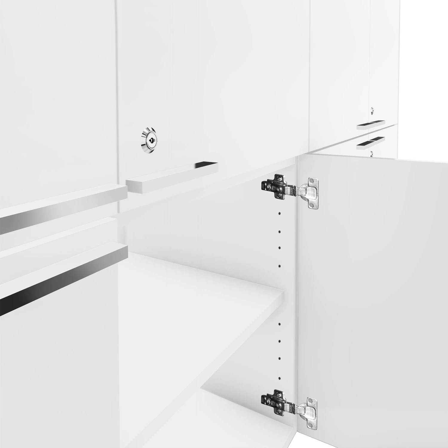 | Ausstattung | 4 Paar Flügeltüren – Soft-Close, 105 ° Öffnung, abschließbar, korrosionsschutzbehandelte Scharniere, Kunststoffgriffe (ABS) in Chrom-Optik, 4 Einlegeböden (durchgängig pro Flügeltür-Paar) |