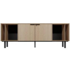 | Gestell-Material | Massivholz, 2 lasergeformte mattschwarze Stahlblech-Leistenpaare als Verbindungsträger, Zylinderförmige Abstandshalter Ø 32 mm H 35 mm |