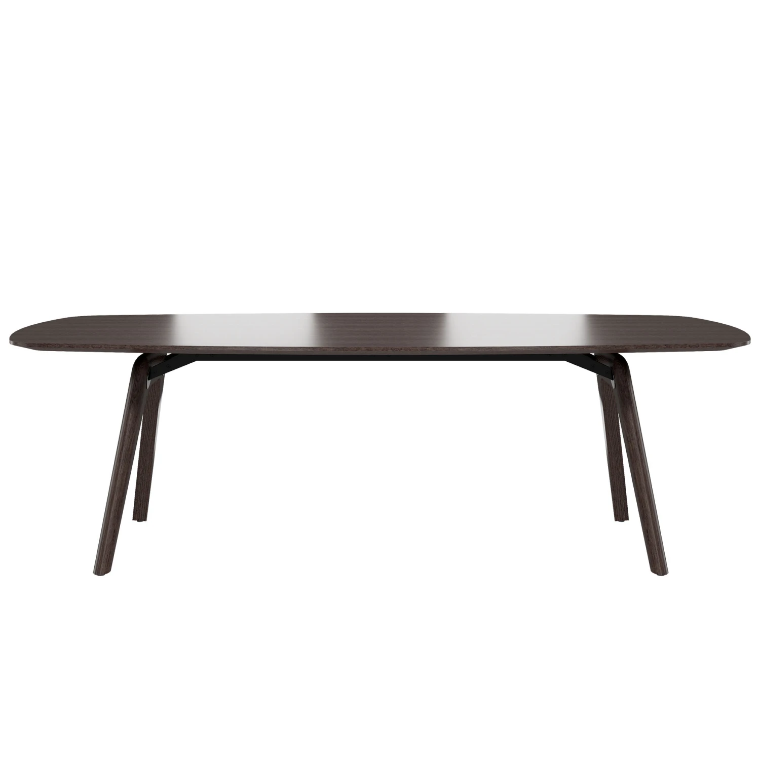- Echtholzfurnier-Tischplatte auf Eiche-Massivholztischbeinen, verbunden mit Stahl-Verbindungsträgern
