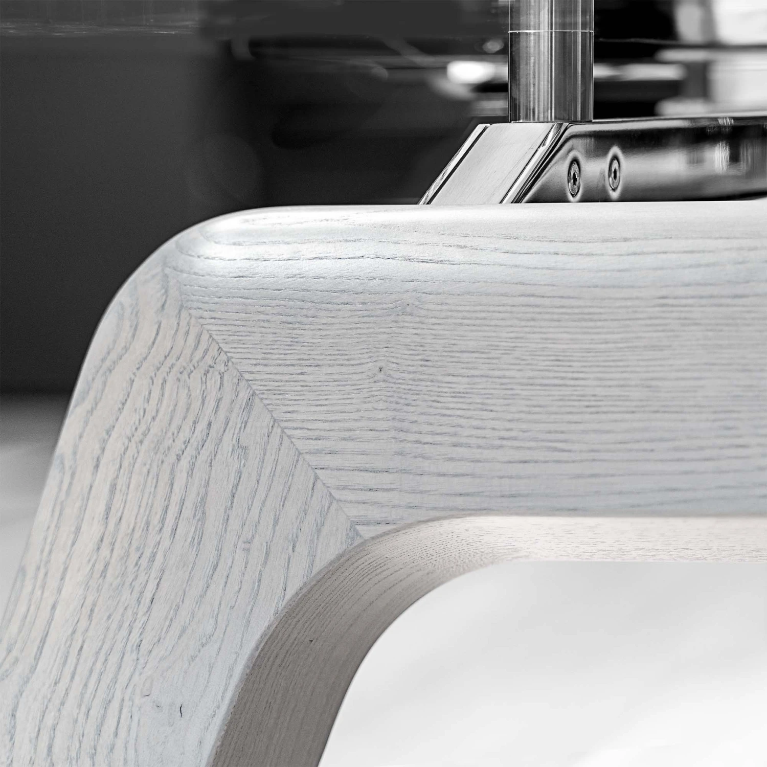 | Gestell-Material | Massivholzbeine 53 mm, 2 lasergeformte verchromte Stahlblech-Verbindungsträger, Zylinderförmige Abstandshalter Ø 32 mm H 35 mm, Kunststofffüße 6 mm hoch mit Höhenausgleich (+10 mm) |