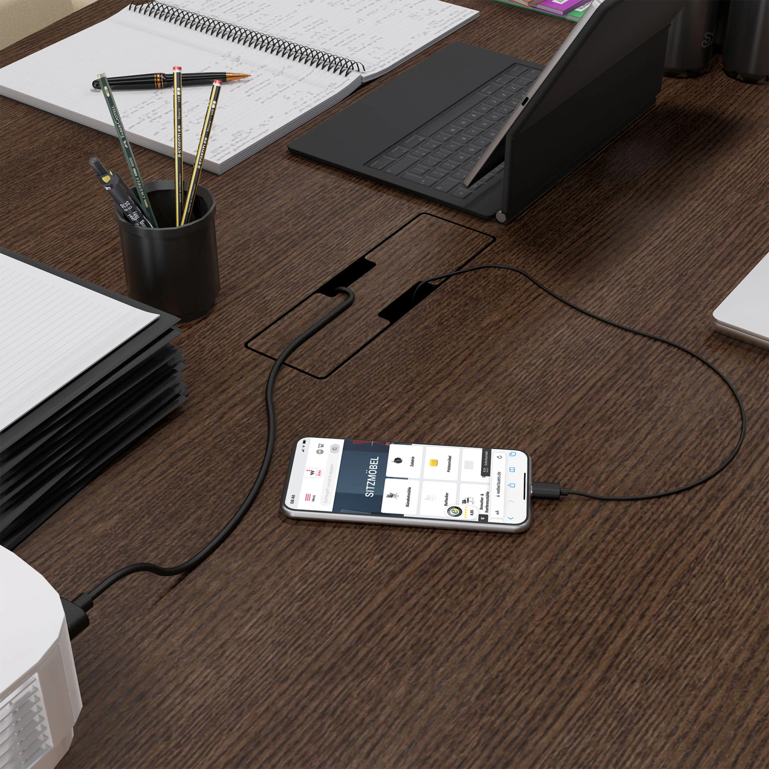 - Optional erhältlich: zwei integrierte Kabelklappen und -wannen