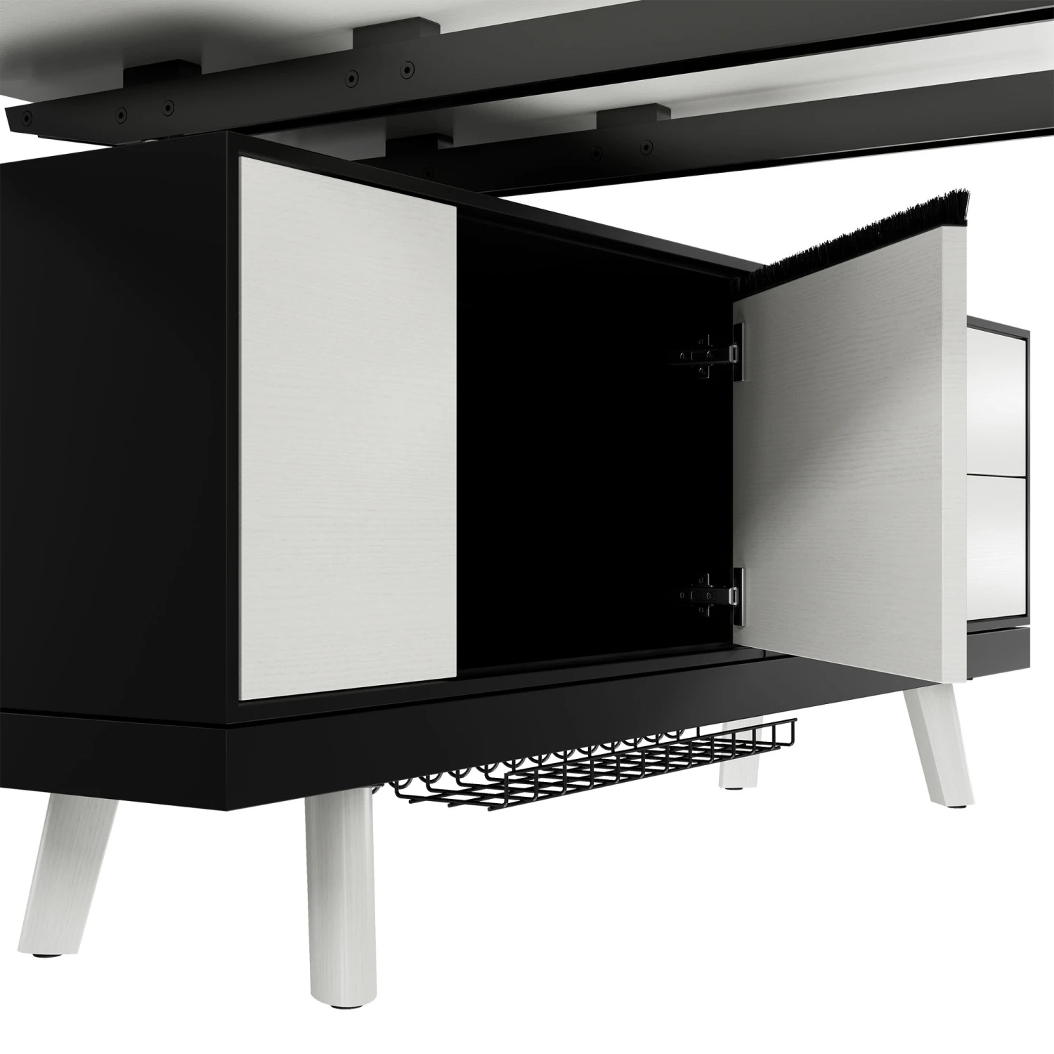 | Ausstattung | Lowboard – 1 CPU Modul mit Kabelführungssystem (Aussparung mit Bürsteneinsatz oben und Ø 80 mm Kabeldurchlass mit Kabelgitter an der Unterseite, Soft-Close |