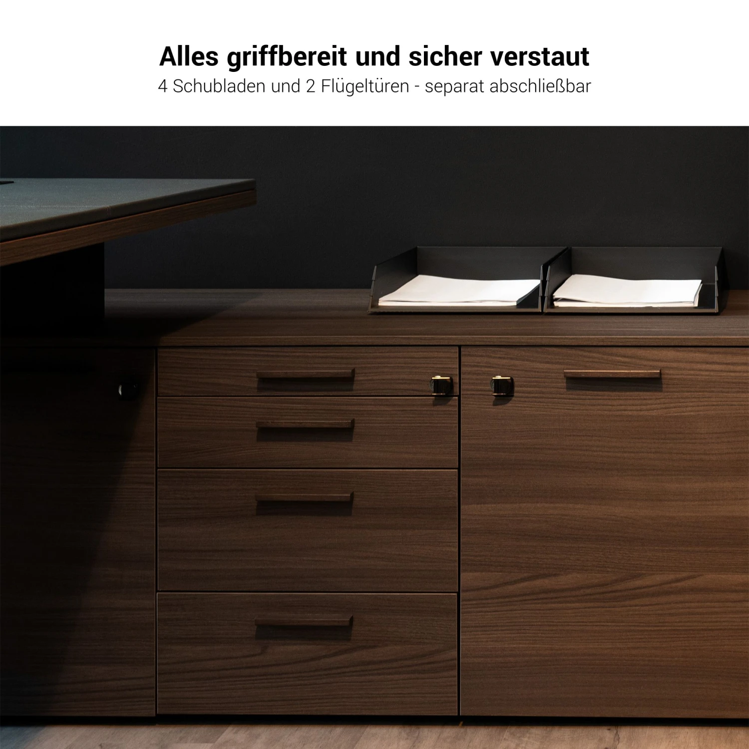 - Wahlweise mit ausziehbarer Schreibtischunterlage aus Kunstleder