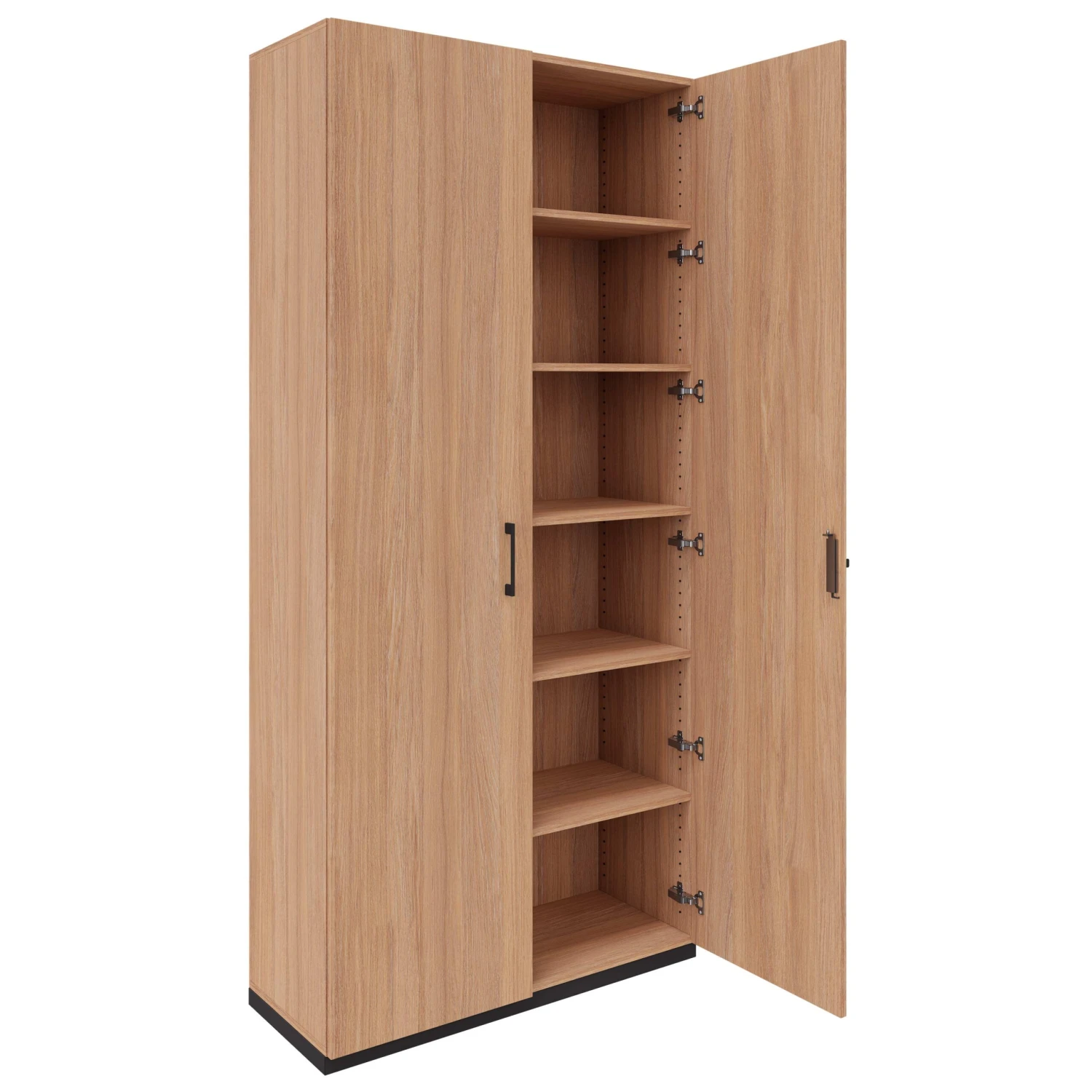 | Ausstattung | 5 Fachböden, Durchgängige Lochreihenbohrung 25 mm, Flügeltüren mit Soft-Close, Marken-Scharniere von Blum®, Bügelgriffe aus pulverbeschichtetem Metall – 128 mm lang, 107° Öffnungswinkel |