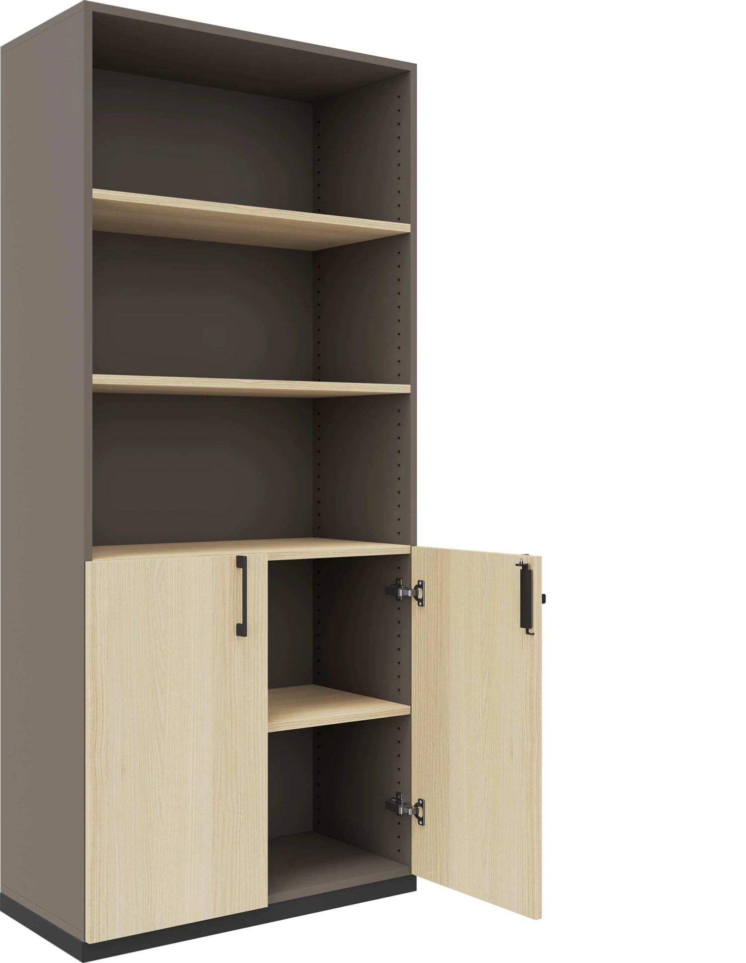 | Ausstattung | 4 Fachböden, Durchgängige Lochreihenbohrung 25 mm, Flügeltüren mit Soft-Close, Marken-Scharniere von Blum®, Bügelgriffe aus pulverbeschichtetem Metall – 128 mm lang, 107° Öffnungswinkel |