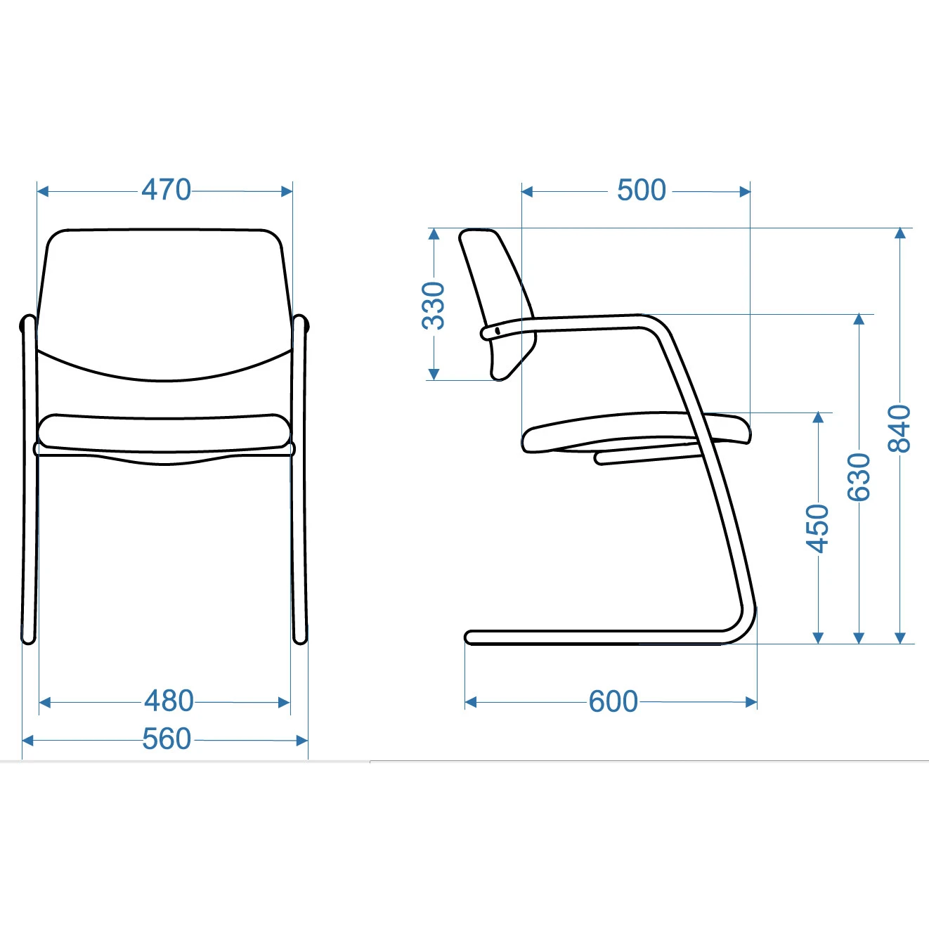 | Maße | BxTxH: 560 mm x 600 mm x 840 mm, Sitzhöhe 450 mm, Sitztiefe 500 mm, Rückenlehne 330 mm |
