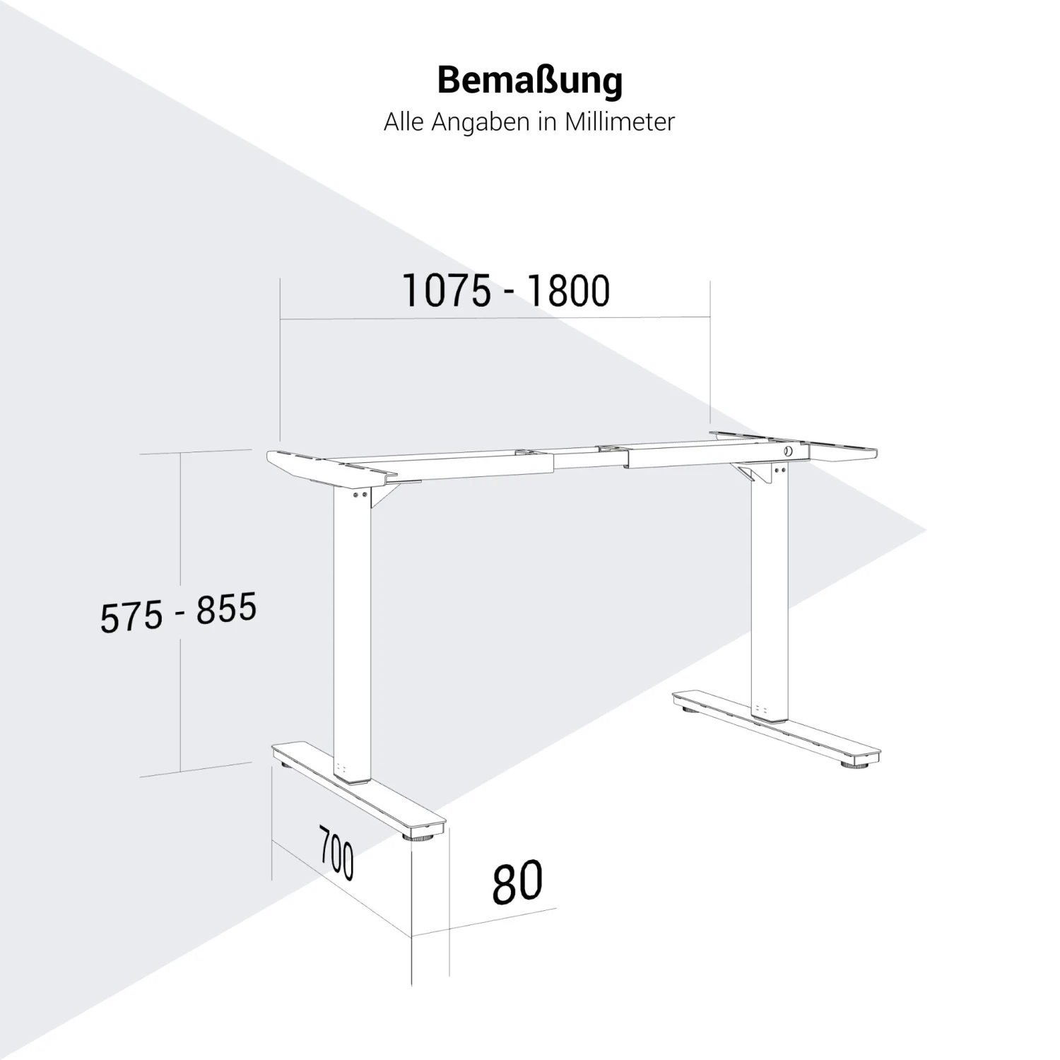| Maße | Breitenverstellbarer Bereich 1075 – 1800 mm, Höhenverstellbarer Bereich 575 – 855 mm, Länge Halterung 600 mm, Länge Fuß 700 m, Säulengrößen 80 x 50 mm |