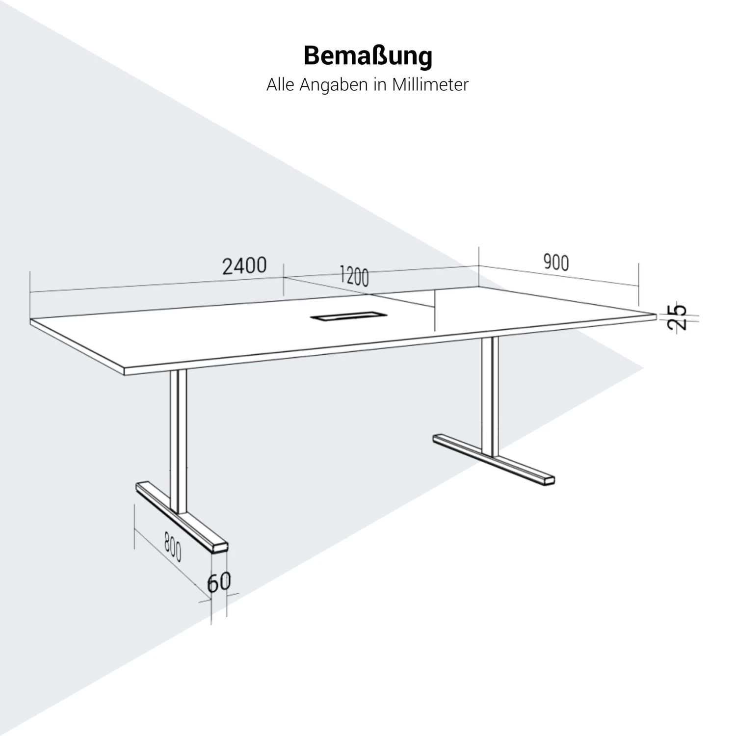 | Materialstärke | Tischplatte 25 mm, Traverse 40 x 20 mm, Beine 40 x 40 mm, Kunststofffüße mit Höhenausgleich (+10 mm), Kabelschacht 317 x 119 x 27 mm, Kabelwanne 360 x 180 x 110 mm |