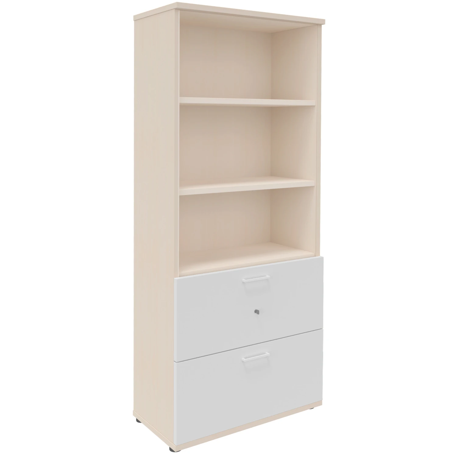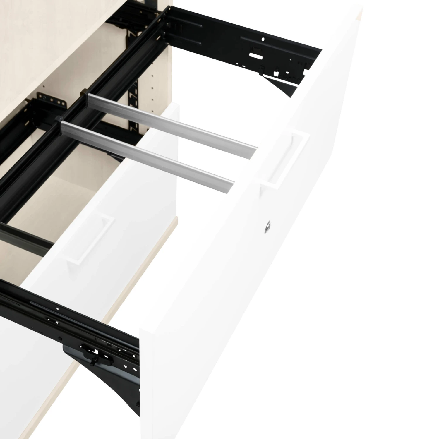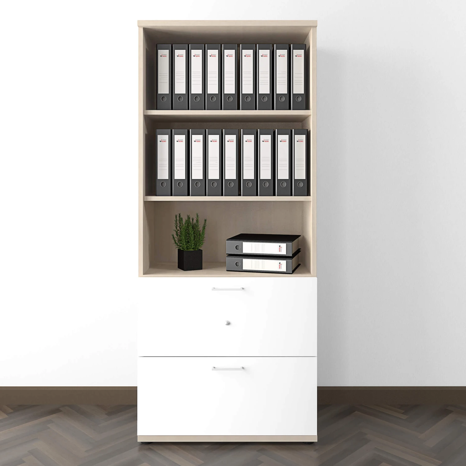 | Ausstattung | 2 Fachböden, 2 Schubladen mit Hängeregister, durchgängige Lochreihenbohrung 25 mm, Bügelgriffe aus pulverbeschichtetm Metall – 136 mm lang |