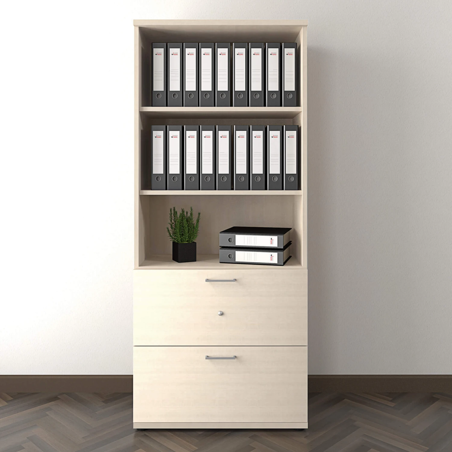 | Ausstattung | 2 Fachböden, 2 Schubladen mit Hängeregister, durchgängige Lochreihenbohrung 25 mm, Bügelgriffe aus pulverbeschichtetm Metall – 136 mm lang |