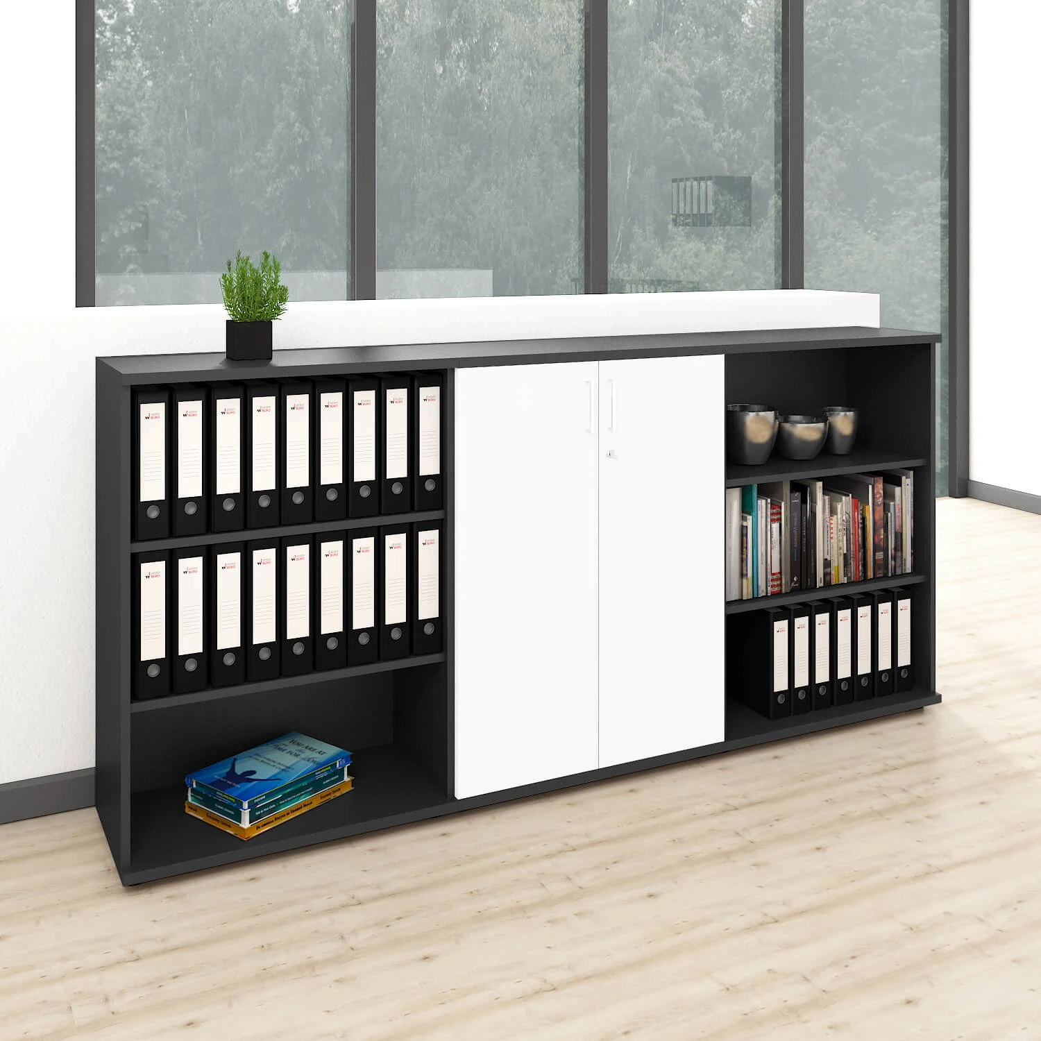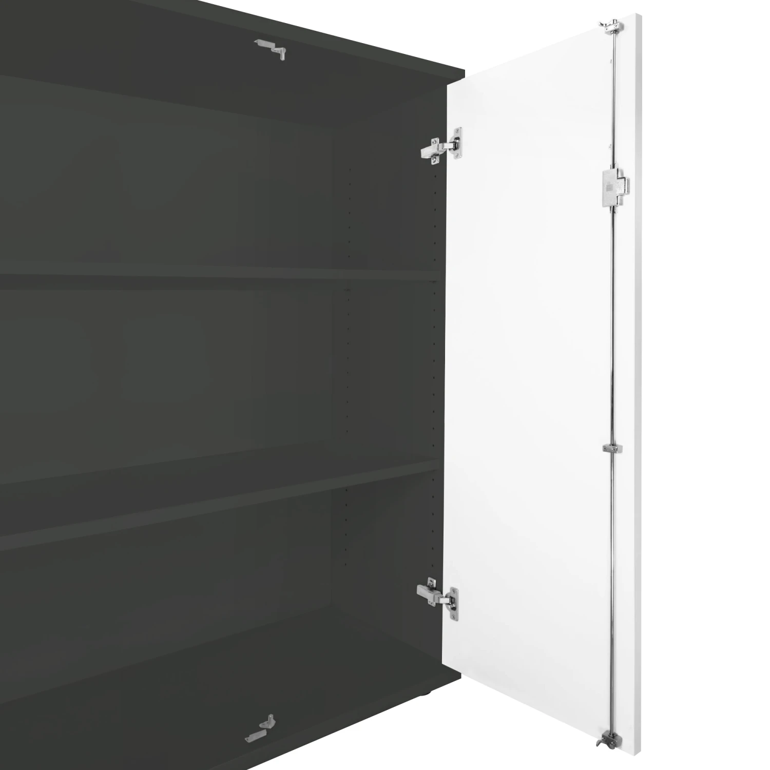 | Ausstattung | Flügeltürenschrank: 2 Fachböden, durchgängige Lochreihenbohrung 25 mm, Marken-Scharniere von Blum®, Bügelgriffe aus pulverbeschichtetem Metall – 136 mm lang, Öffnungswinkel: 100°, Türen lassen sich einfach und werkzeugfrei über ein Klicksystem montieren Regalschrank: 2 Fachböden, durchgängige Lochreihenbohrung 25 mm |