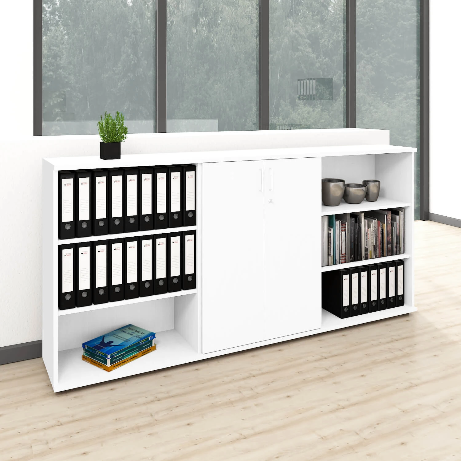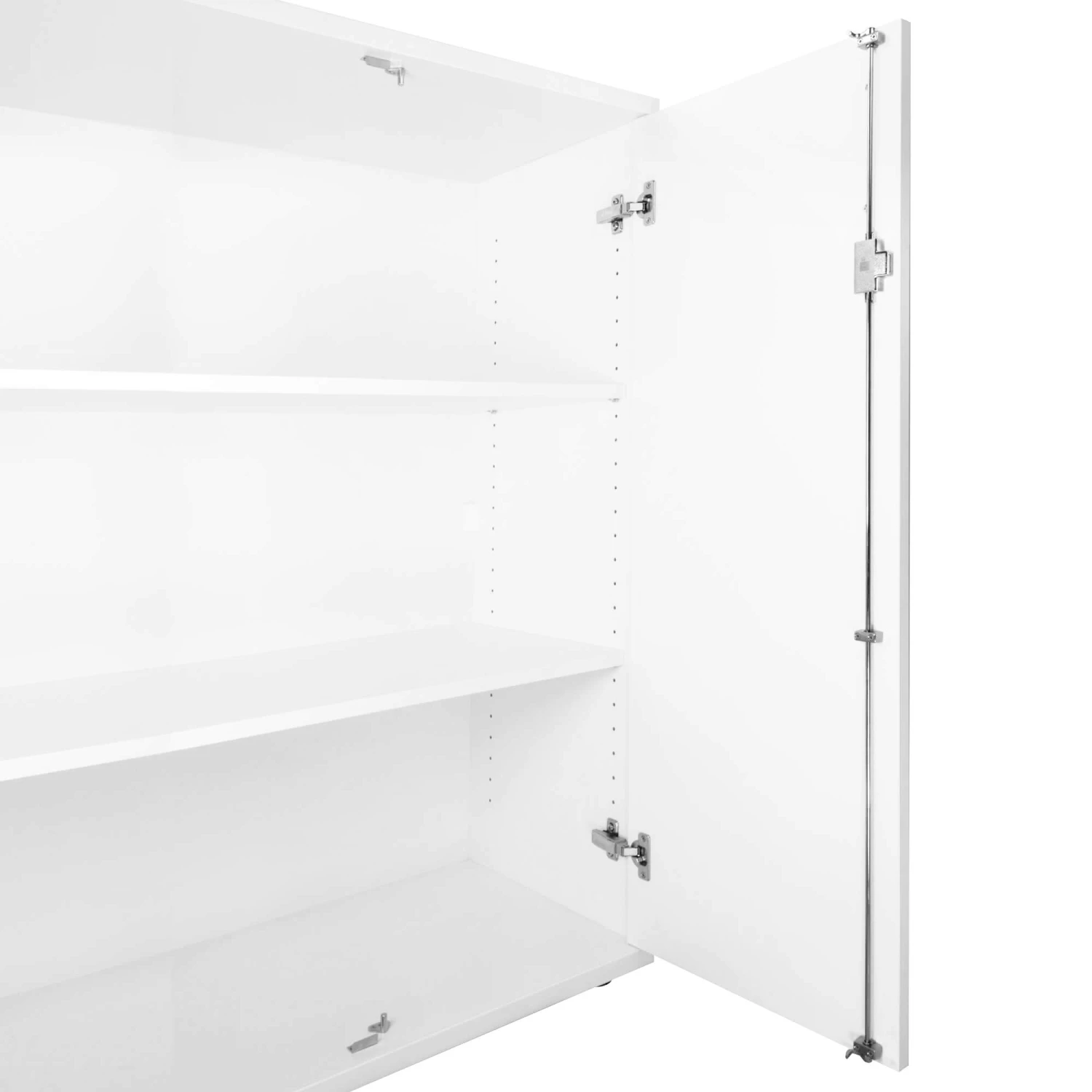 | Ausstattung | Flügeltürenschrank: 2 Fachböden, durchgängige Lochreihenbohrung 25 mm, Marken-Scharniere von Blum®, Bügelgriffe aus pulverbeschichtetem Metall – 136 mm lang, Öffnungswinkel: 100°, Türen lassen sich einfach und werkzeugfrei über ein Klicksystem montieren Regalschrank: 2 Fachböden, durchgängige Lochreihenbohrung 25 mm |