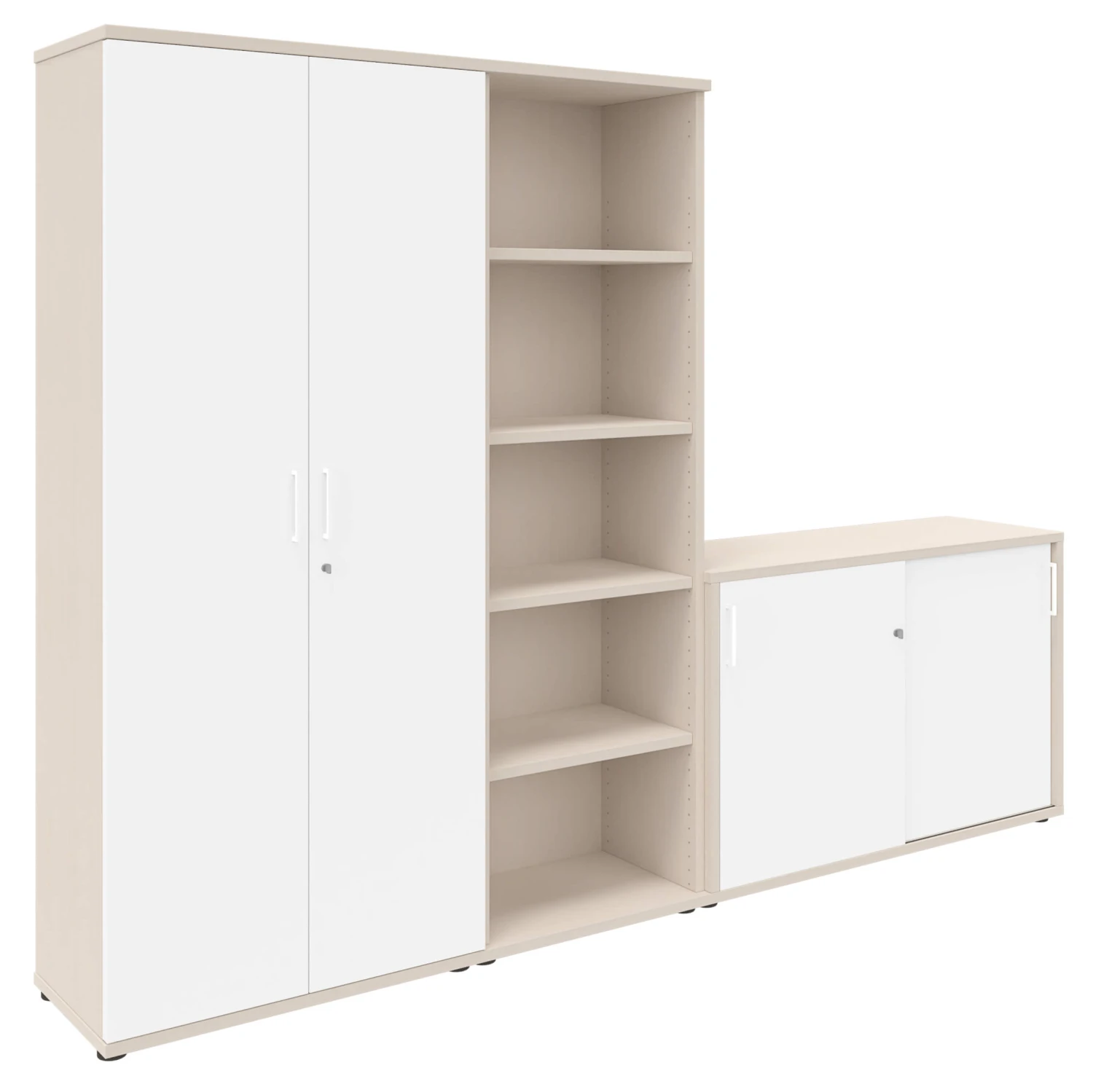 - bestehend aus: 1x Flügeltürenschrank, 1x Regalschrank, 1x Schiebetürenschrank 2OH