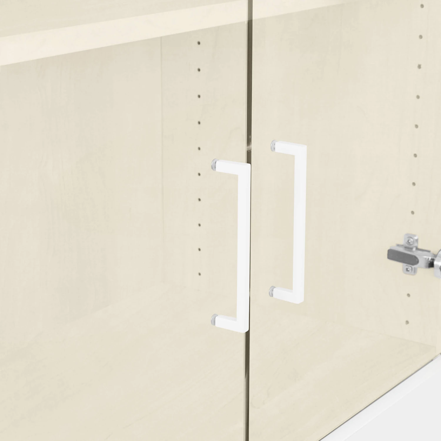 | Ausstattung | 4 Fachböden, durchgängige Lochreihenbohrung 25 mm, Marken-Scharniere von Blum®, Bügelgriffe aus pulverbeschichtetm Metall – 136 mm lang, Öffnungswinkel: 100°, Türen lassen sich einfach und werkzeugfrei über ein Klicksystem montieren |