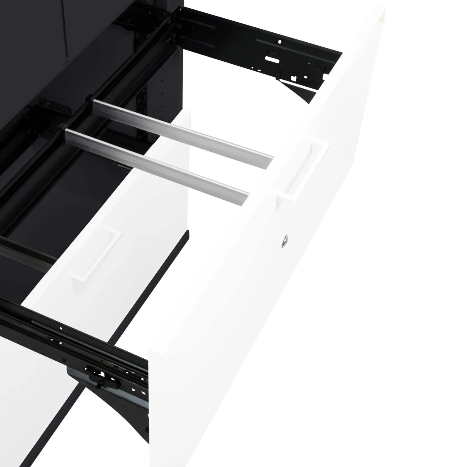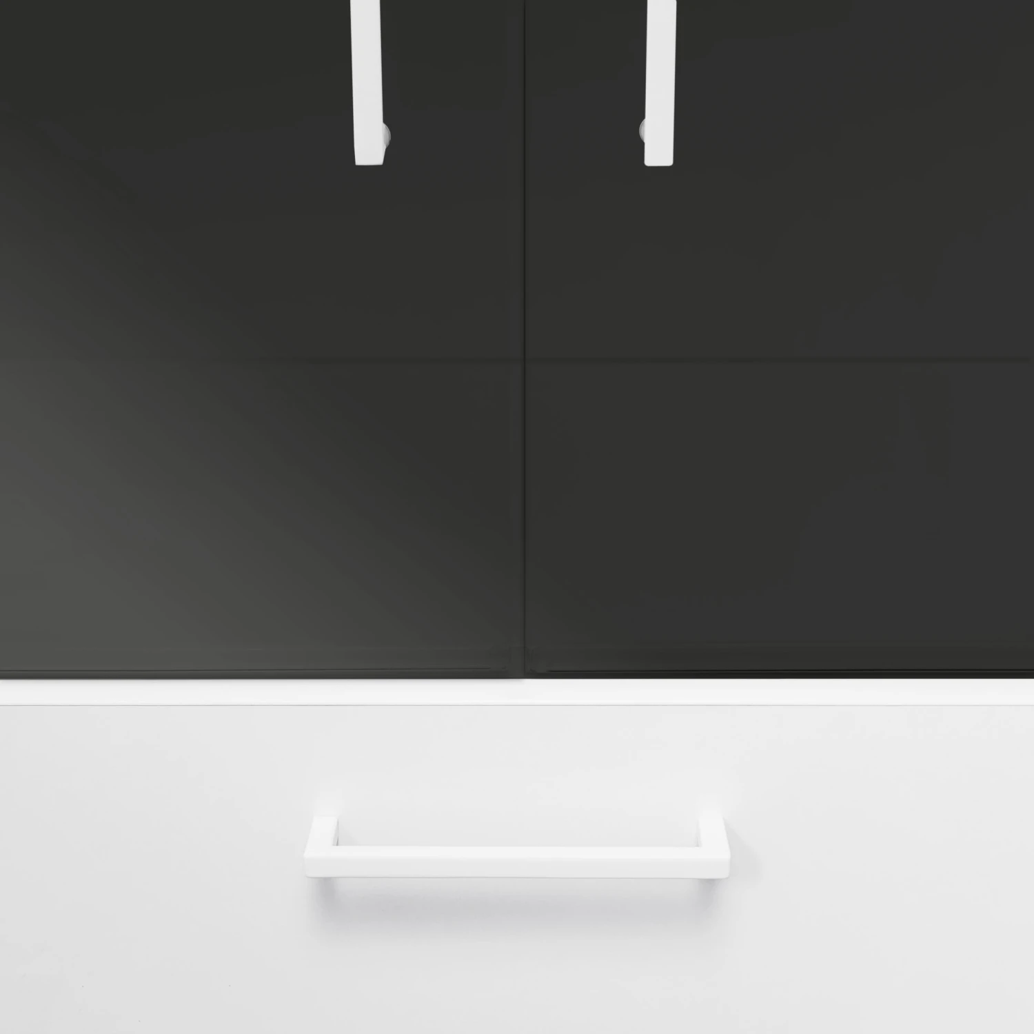 | Ausstattung | 2 Fachböden, 2 Schubladen mit Hängeregister, durchgängige Lochreihenbohrung 25 mm, Bügelgriffe aus pulverbeschichtetm Metall – 136 mm lang |
