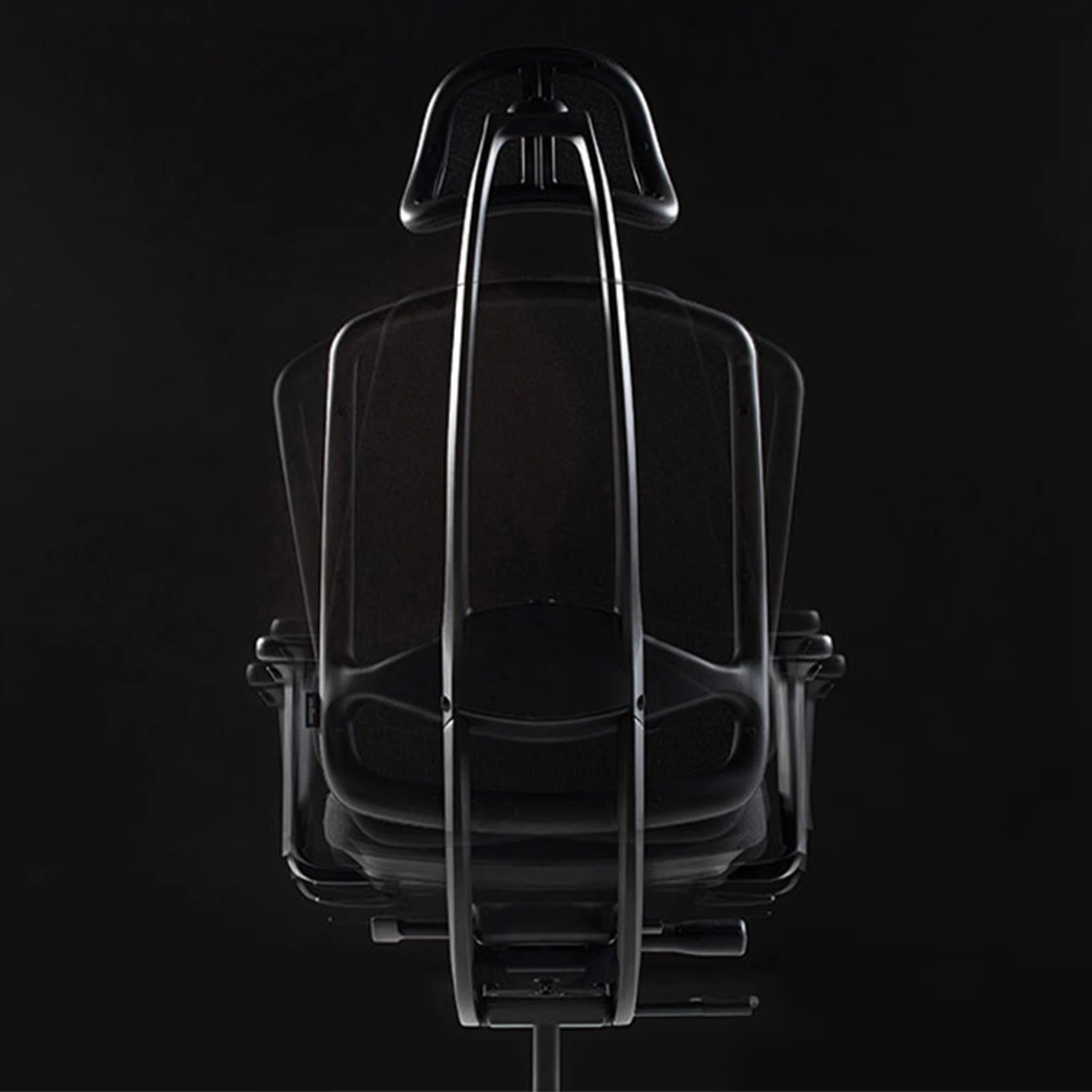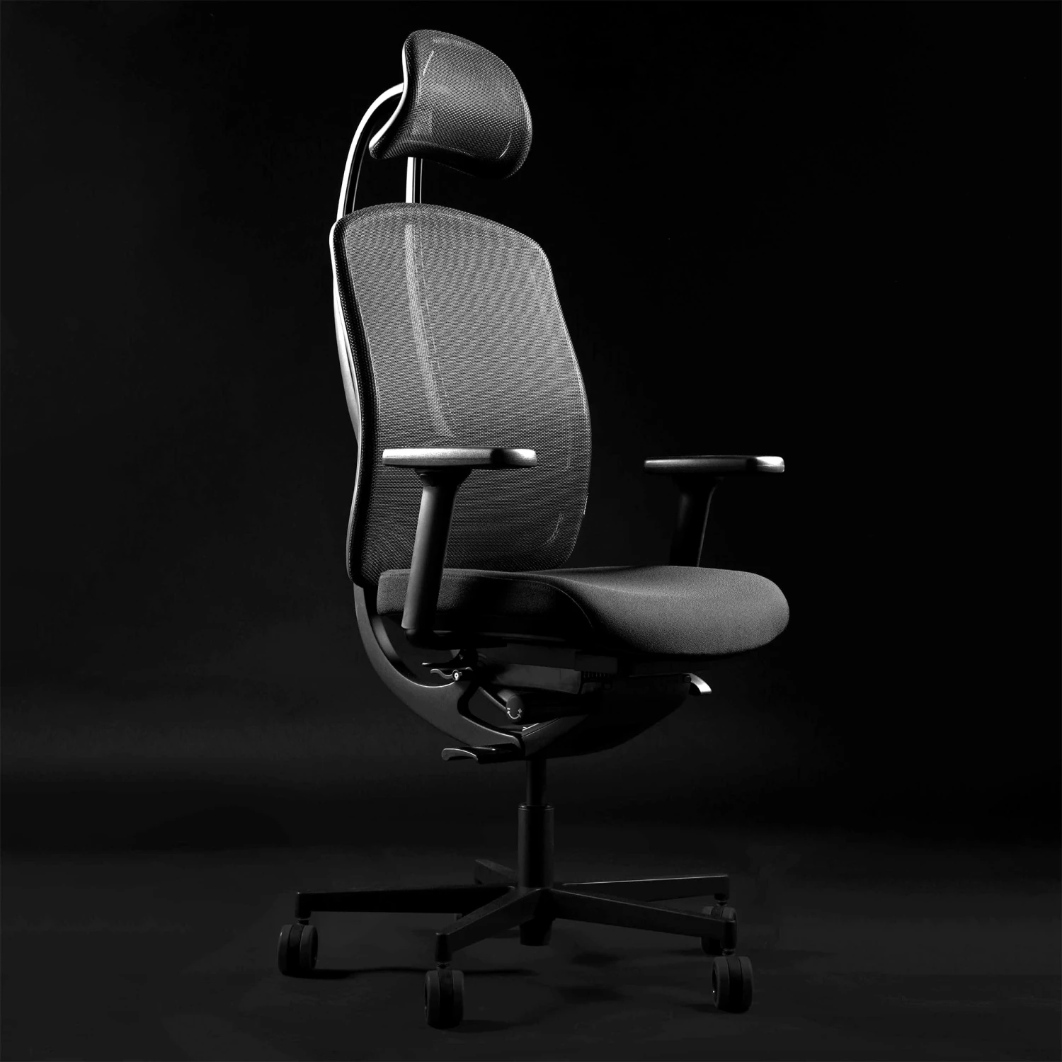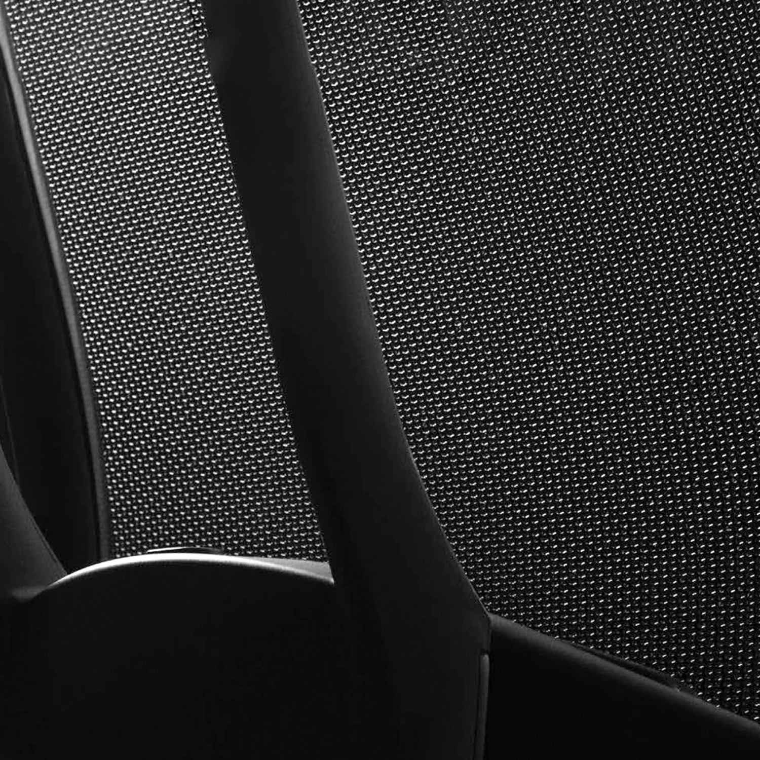 - All-Black: Alle sichtbaren Stuhlelemente schwarz und graphit-schwarz gepulvert