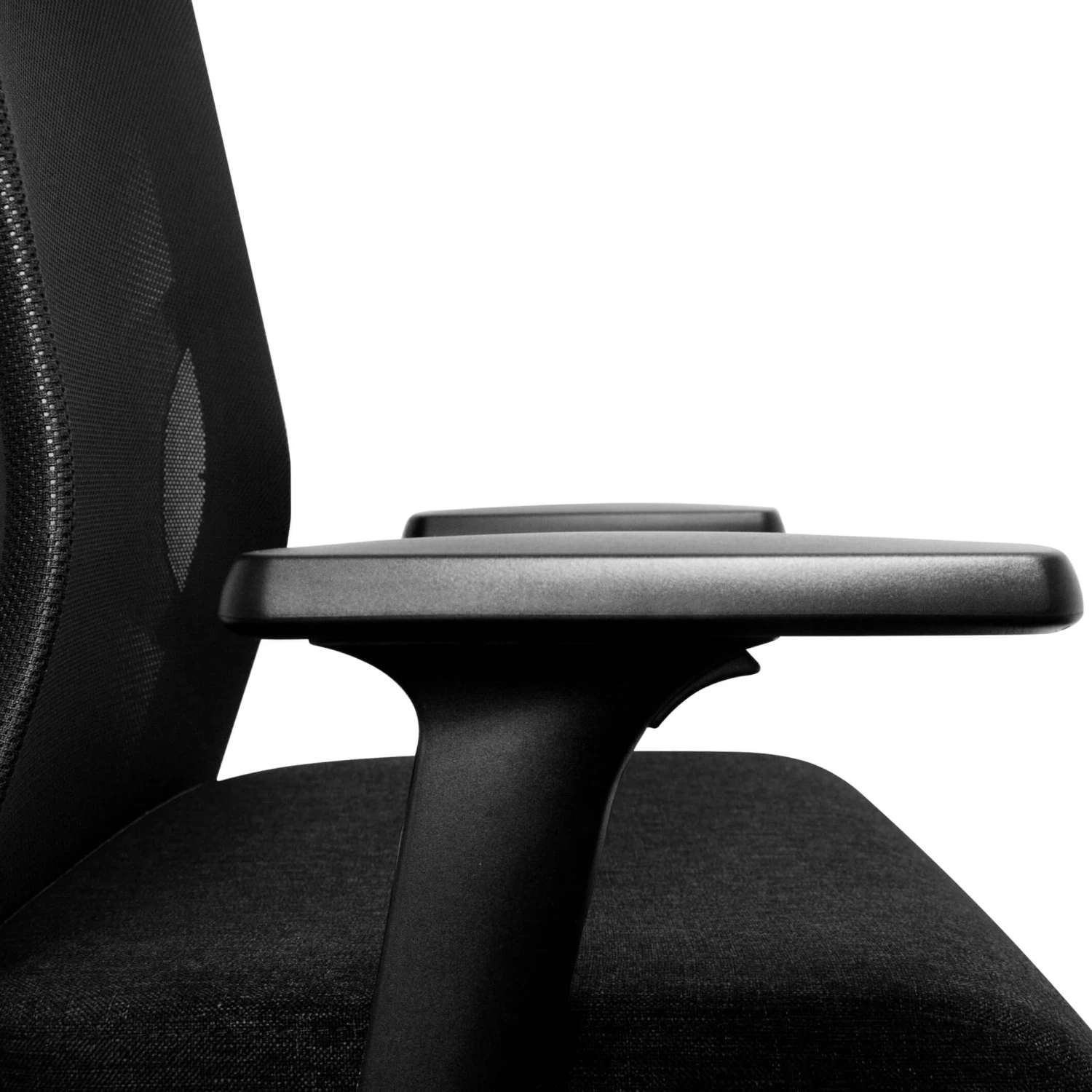- Ausstattung: Netzrücken KM1 – Schwarz, Sitzbezugsstoff GE1 – Schwarz, Rahmen schwarz, Fußkreuz Kunststoff schwarz, 2D-Armlehnen Kunststoff schwarz
